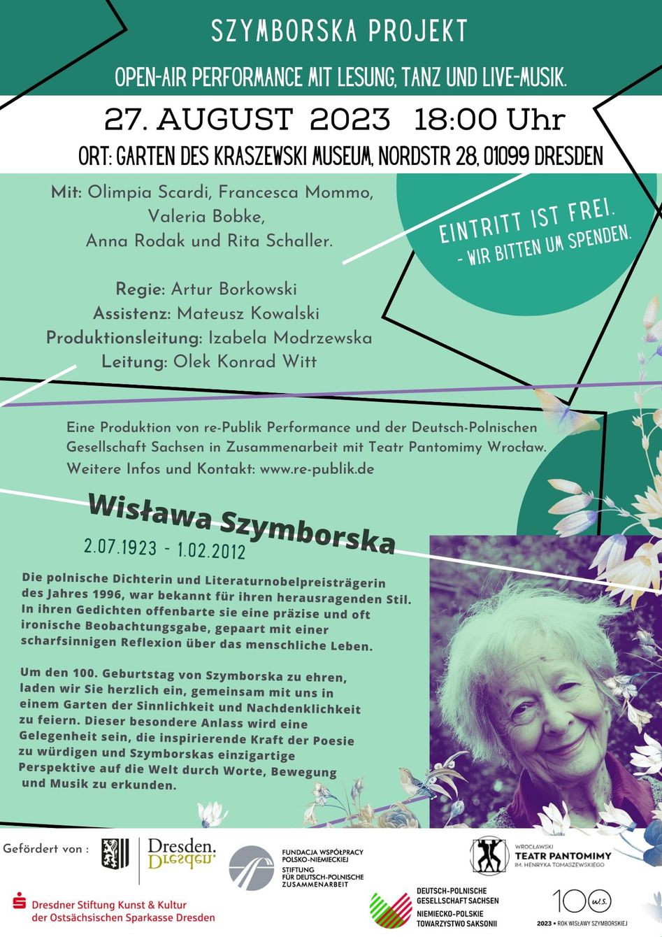Zur Ehrung des 100. Geburtstags von Szymborska lädt ein deutsch-polnisches Ensemble zu einer musikalischen und tänzerischen Performance in den Garten des Kraszewski Museums ein. Diese Veranstaltung bietet eine Gelegenheit, die inspirierende Kraft der Poesie zu erleben und Szymborskas einzigartige Perspektive auf die Welt durch Worte, Bewegung und Musik zu erkunden.