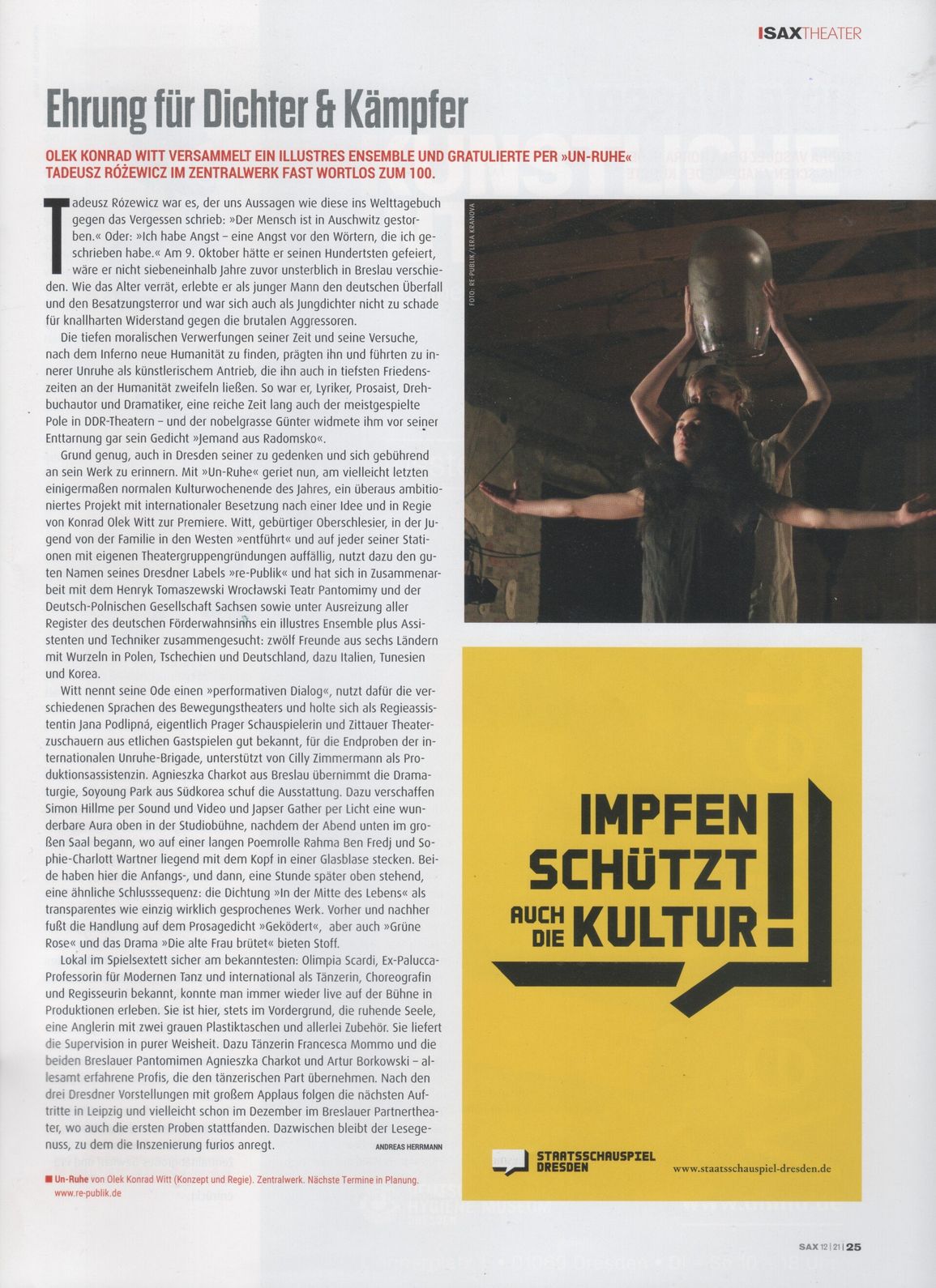 „Ich habe Angst. … eine Angst vor den Wörtern, die ich geschrieben habe“.dertste Geburtstag des polnischen Dichters Tadeusz Różewicz ist ein Anlass für einen performativen Dialog, der hier in verschiedenen Sprachen des Theaters auf-geführt wird. Ein Das Konzept der Aufführung geht sowohl auf das Prosagedicht „Geködert“ als auch auf andere Texte von Różewicz zurück. Die Performer*innen gehen der Frage nach, ob und wie Różewiczs Werk heute noch relevant ist und was er uns über den Zustand der modernen Zivilisation und über die alltäglichen Realitäten/Absurditäten des Menschen sagt. Unter den Schichten der scheinbaren Normalität schlummert das Ungeheuerliche, ein Trauma. – Różewicz schreibt „der Mensch ist in Auschwitz gestorben“. Wir leben im Schatten eines Verbrechens, das keine Kulturschönfärberei übertünchen kann.